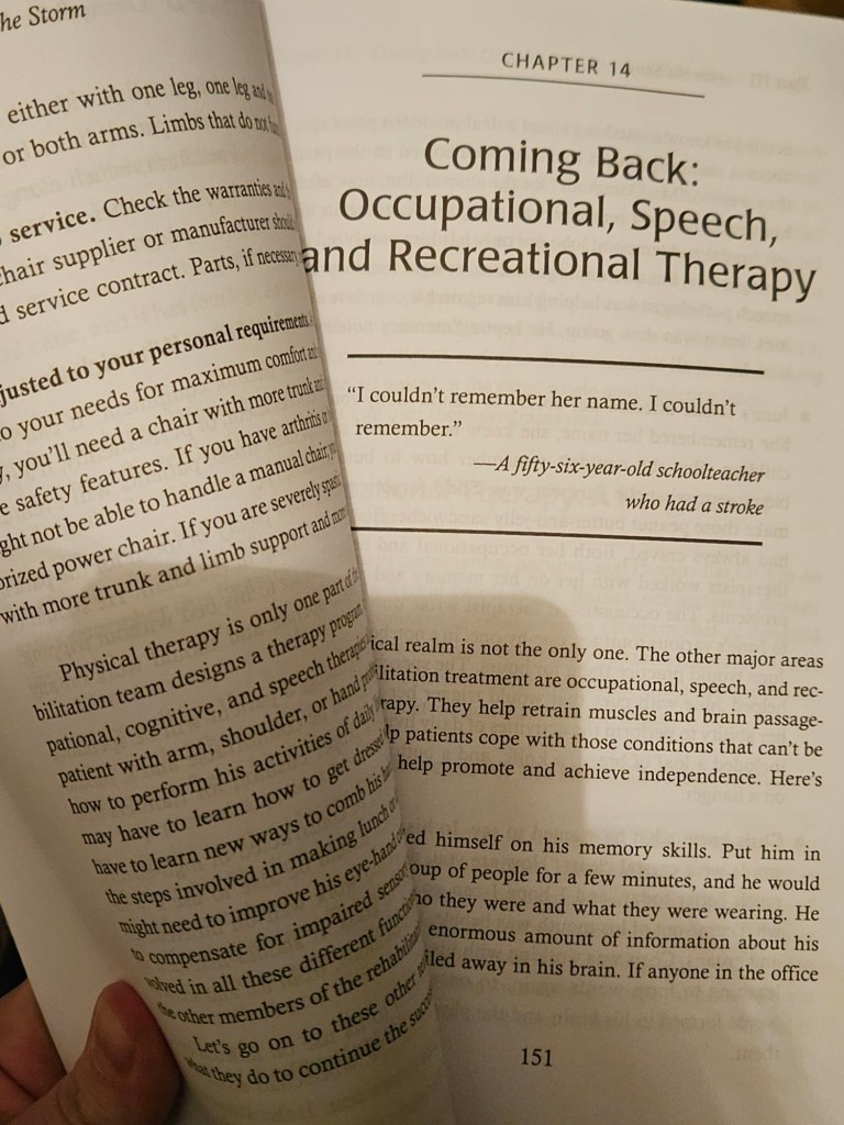 One of the most helpful aspects of this book is how it acknowledges both the medical and emotional sides of stroke recovery. It doesn’t just cover PT, OT, and speech therapy—it also talks about grief, relationships, and adjusting to new realities. It recognizes that stroke affects not just the survivor, but the entire family.